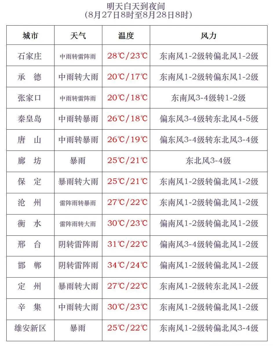 明天夜间到28日,全省阴,承德中东部、唐山、秦皇岛、保定东部、雄安新区、廊坊、石家庄东部、沧州、衡水、邢台东部有中到大雨,其中承德南部、唐山、秦皇岛、保定东部、雄安新区、廊坊、沧州北部、衡水北部部分地区有暴雨,个别地点有大暴雨,其他地区有小到中雨。降雨时局地伴有雷电、短时强降水、短时大风等强对流天气。