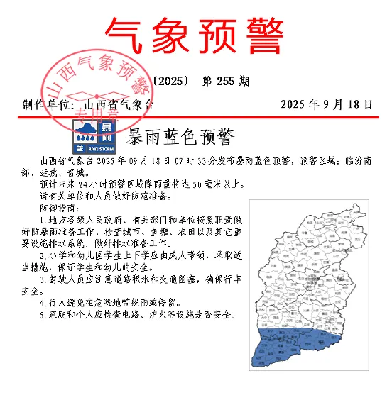 山西省气象台2025年09月18日07时33分发布暴雨蓝色预警,预警区域:临汾南部、运城、晋城。预计未来24小时预警区域降雨量将达50毫米以上。请有关单位和人员做好防范准备。