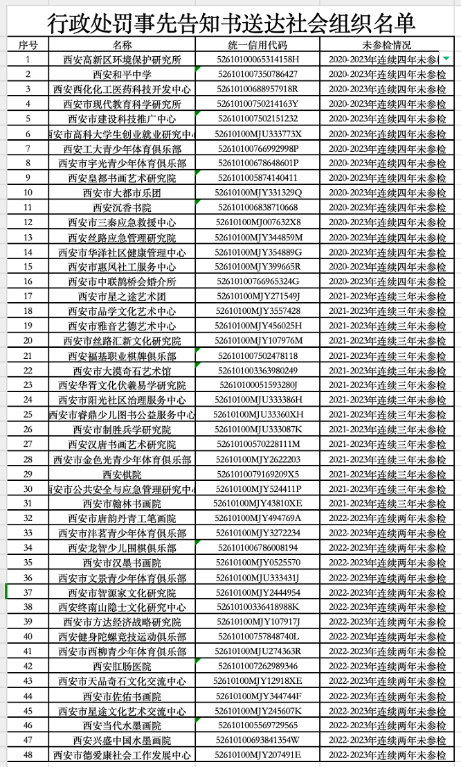 近日,西安市民政局发布《行政处罚事先告知书》送达公告,拟对西安高新区环境保护研究所等48家社会组织作出撤销登记的行政处罚。