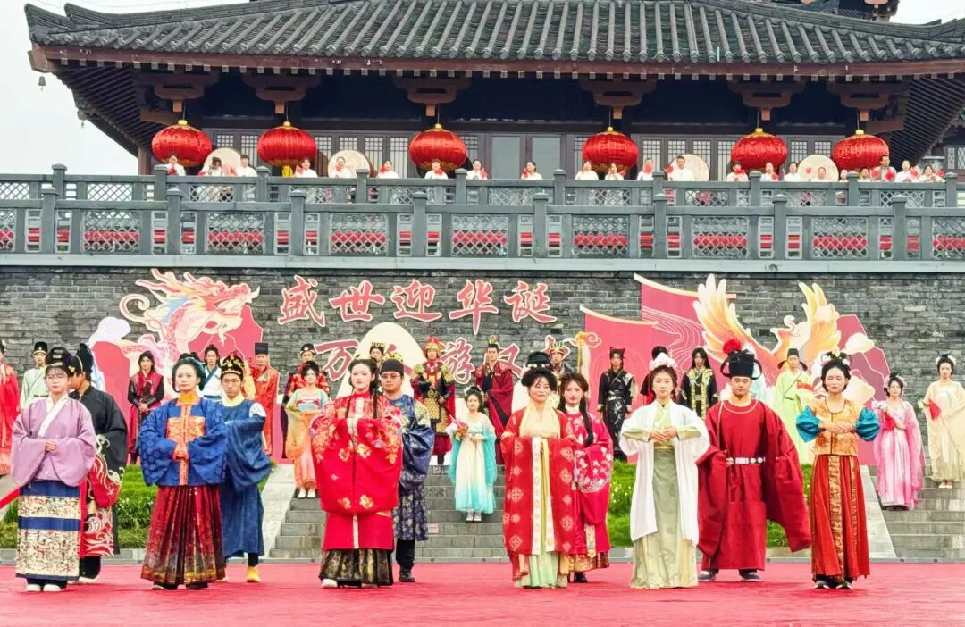 数百名汉服爱好者身着秦、汉、南北、唐、宋等各朝代汉服,通过艺术形式,展现汉服演变历史。不同时期的汉服走秀表演,如同穿越时空的华丽列车,在一步一风情中尽展曲裾深衣的庄重、齐胸襦裙的华美,让市民游客感受盛世华章的璀璨光芒。