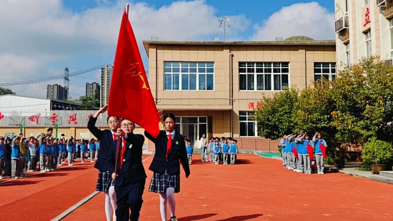 活动在激昂的出旗曲中拉开帷幕。两名护旗手护卫着鲜艳的队旗稳步前行,全体少先队员肃立敬礼,五年级一班张嘉小七同学指挥合唱《中国少年先锋队队歌》,嘹亮的歌声彰显着新时代少先队员的蓬勃朝气。