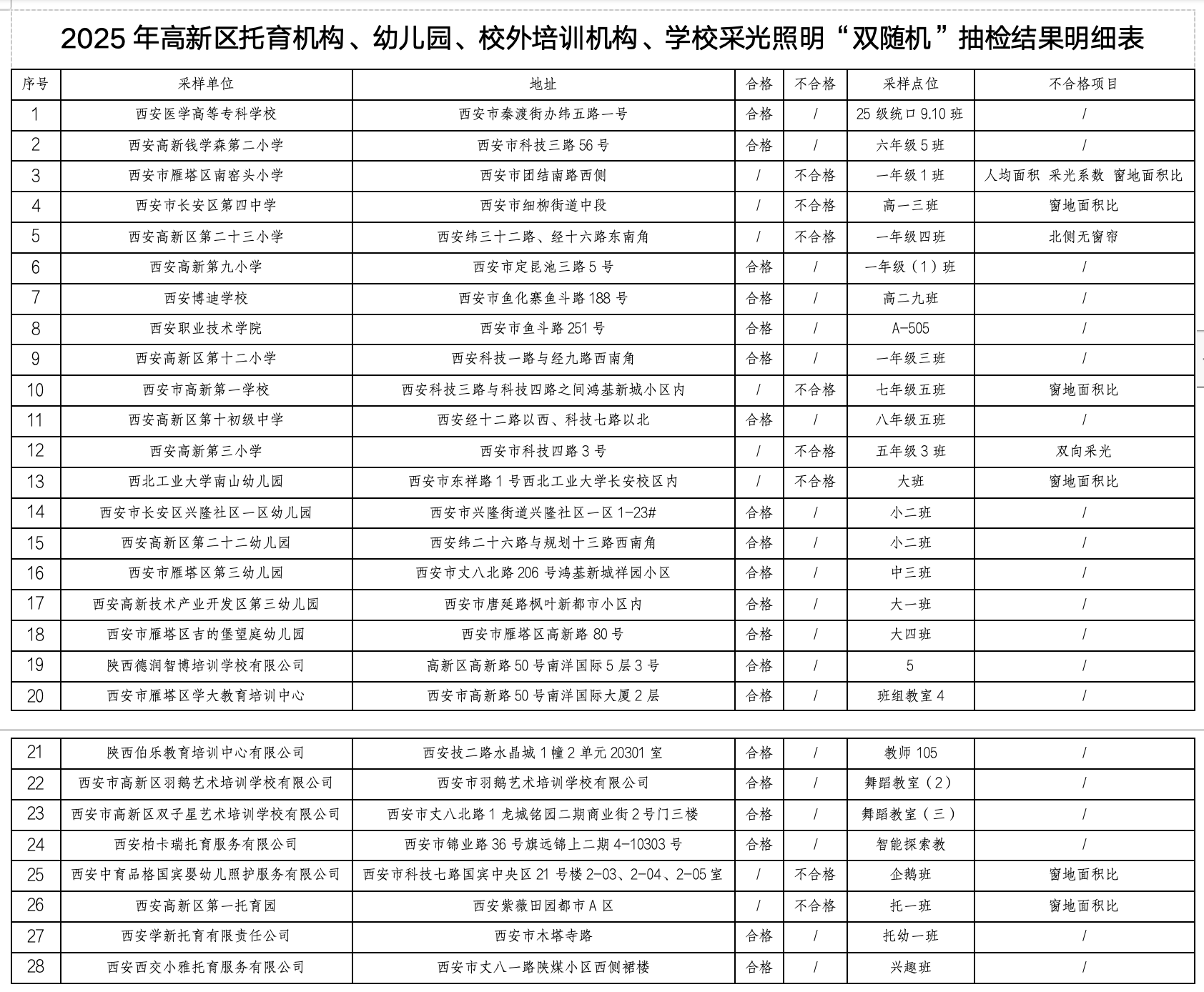 10月14日,西安市高新区社会事业服务局发布《2025年高新区托育机构、幼儿园、校外培训机构、学校采光照明“双随机”抽检结果公示》。高新区社会事业服务局委托第三方检测机构开展抽检工作,抽检单位28家,采样点位28个。经检测,采光照明抽检结果合格的单位有20家,存在不合格指标的单位有8家。