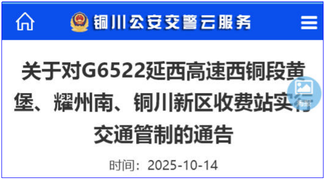 司机朋友请注意!铜川公安交警10月14日发布通告,因G6522延西高速清峪河大桥(西安方向)计划施工,2025年10月20日至12月31日期间,沿线三个收费站的西安方向入口将临时关闭,请注意绕行。