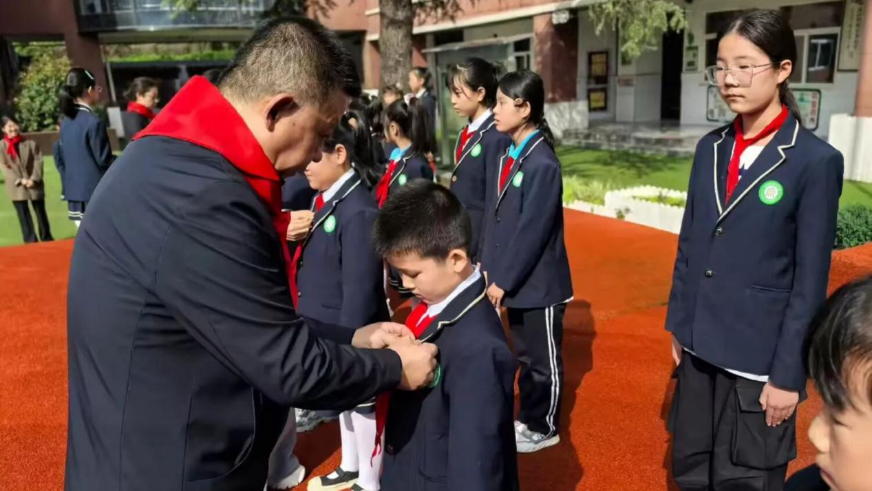 大队辅导员宣读新队员名单后,老队员为新队员佩戴红领巾。当鲜艳的红领巾飘扬在胸前,新老队员互敬队礼,传承的不仅是红领巾,更是少先队的精神与力量。在火红的队旗下,新队员们高举右拳庄严宣誓:“我是中国少年先锋队队员,我在队旗下宣誓……”铿锵誓言响彻校园,表达了为共产主义事业贡献力量的决心。
