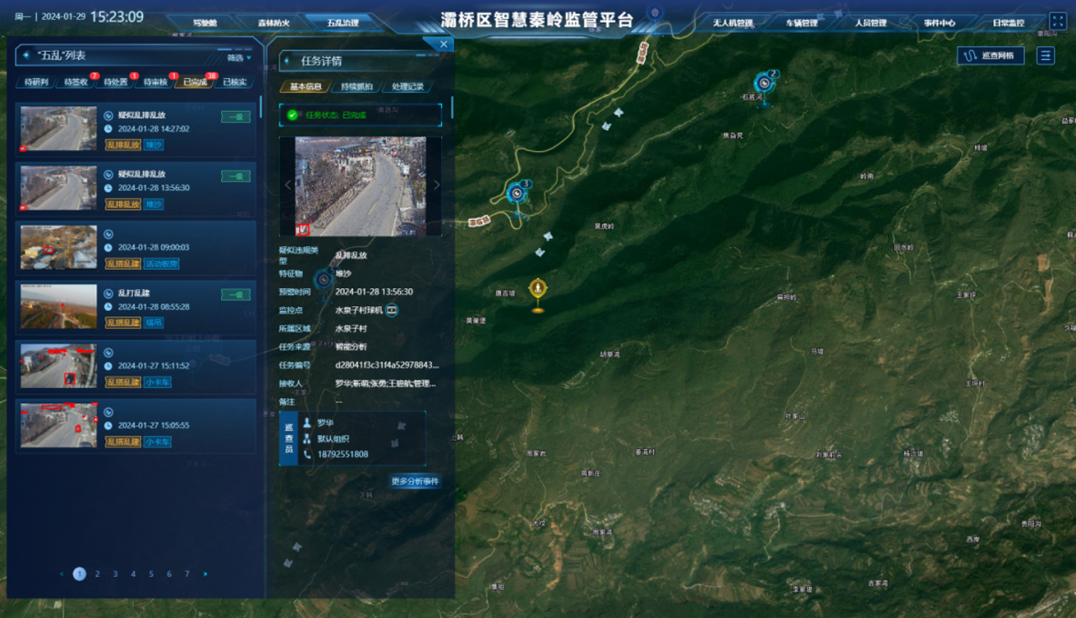 该平台接入了26路前端感知设备,综合运用中载云台、双光谱云台、智能球机及无人机等,构建起一张覆盖重点区域的“天眼”监测网。平台能够对重点区域的林木防火、动植物保护、地质灾害、人为活动等进行全天候、立体化的监测,实现“在线监管+实地巡查”协同发力,确保“五乱”问题动态清零,提升了生态保护的精准度和效率。
