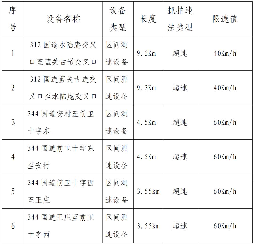 通告显示,此次新增的测速设备主要布设在312国道和344国道的部分路段,涵盖水陆庵交叉口至蓝关古道交叉口、安村至前卫十字等多个关键区间。其中,312国道相关路段的限速值为40公里/小时,344国道相关路段的限速值为60公里/小时。(记者 张黎江)