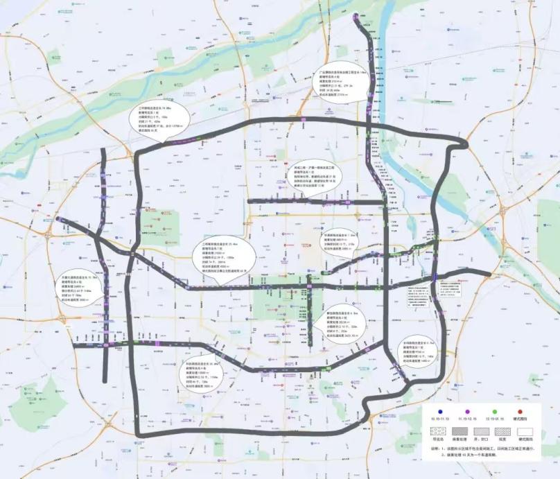此次微改造工程规模不小。其中,“三桥新街-大庆路-长乐路”一线,西起西绕城高速,东至东三环,全长25.4公里,串联起8条城市主干道。施工将分阶段围挡20处交叉口和10处路段,整体工期108天,从2025年10月31日开始至2026年2月15日结束。