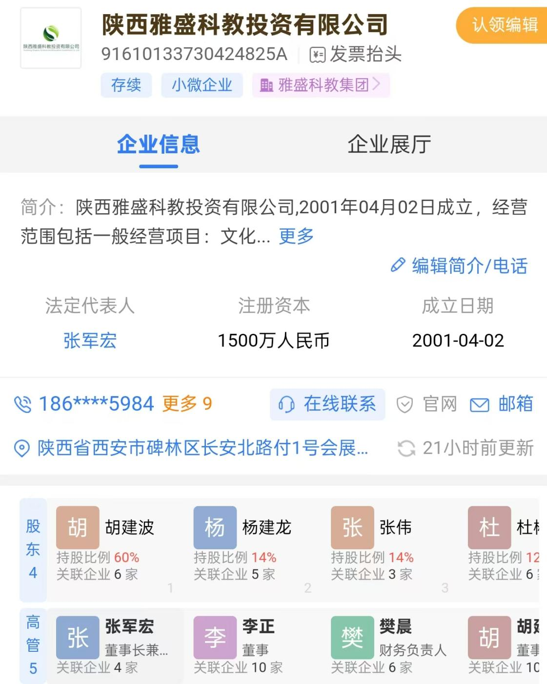 10月29日,教育部公示信息显示,西安欧亚学院的举办者拟由创始人胡建波、杨建龙等变更为“陕西雅盛科教投资有限公司”。值得关注的是,该公司法定代表人、董事长为张军宏,而胡建波仍持有60%股权,杨建龙持股14%。