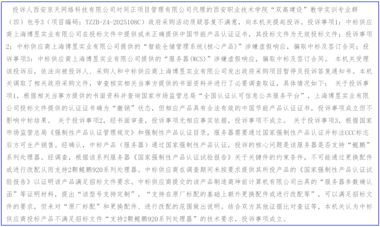 据悉,该项目为西安职业技术学院“双高建设”教学实训专业群(四)采购,在招投标环节结束后,未中标的西安京天网络科技有限公司提起了投诉。