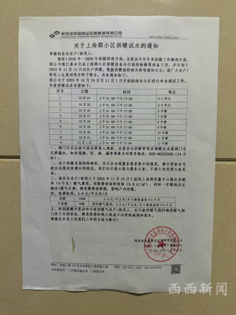 10月28日,西西新闻记者来到西安市未央区长河·上尚郡小区,业主孙先生称,该小区供暖收费为5.8元/㎡/月×建筑面积×4个月,空置房按照50%收费,即不供暖收费为2.9元/㎡/月×建筑面积×4个月,这些都是物业单方面定价,也没有公示采暖期间的损耗费用。业主黄女士则抱怨,即便正常缴费,去年小区暖气也并不热,仍需辅以空调取暖,“但没想到空置房还收50%的取暖费,收费标准不知道是什么。”