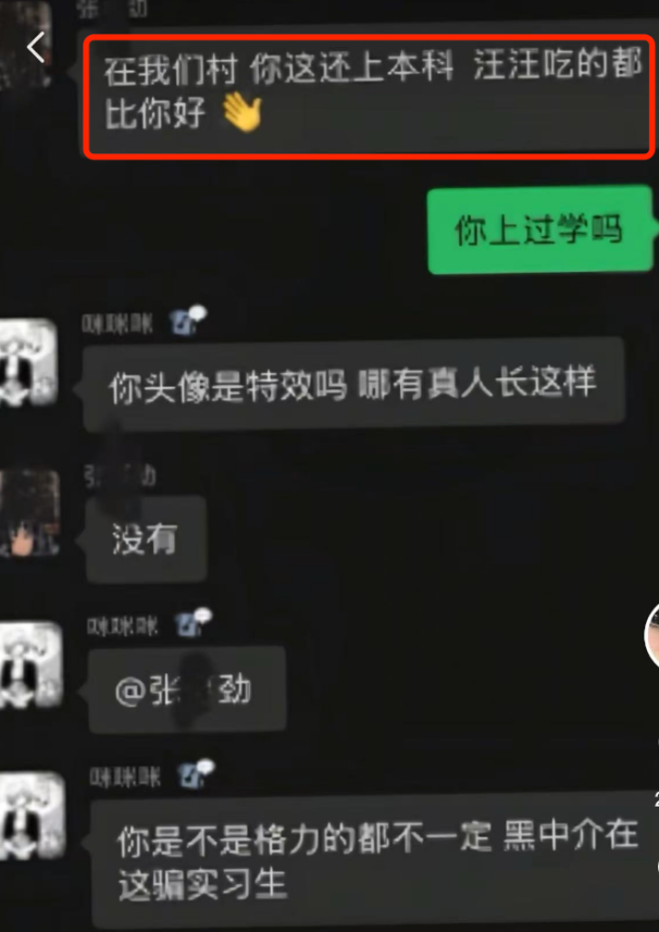 紧接着,张某劲发布了“看清了再讲话,本科四年不是叫你吃干饭的”“在我们村,你还上本科,汪汪吃的都比你好”“你连中介挣得多都没”等言论。