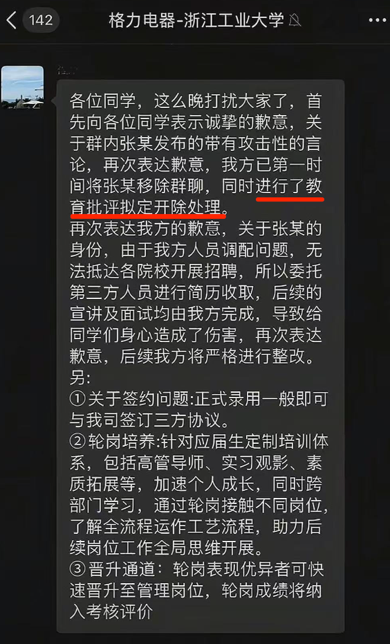 11月2日,该女大学生第二次针对该事件发布视频称,杭州易鑫人力资源有限公司负责人潘某确认张某劲为该中介公司员工。但格力电器杭州有限公司校招群里,宣讲人致歉表示,已对张某劲进行了教育批评,拟定开除处理。该女大学生表示,张某劲并非格力电器的员工,不清楚为什么用开除一词语。