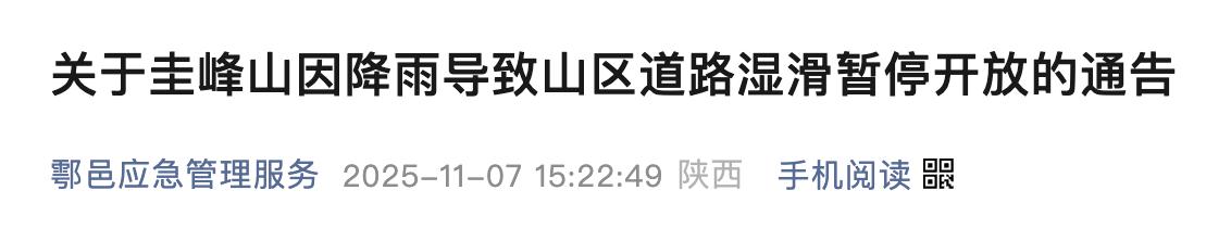 11月7日,西安市鄠邑区应急管理局、西安市鄠邑区文化和旅游体育局、西安市鄠邑区景区管理局发布《关于圭峰山因降雨导致山区道路湿滑暂停开放的通告》。