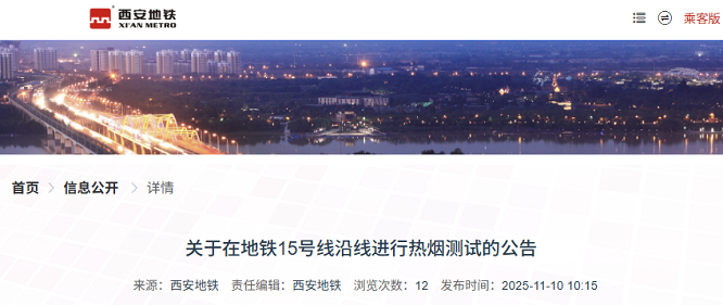 11月10日,西西新闻记者从西安地铁获悉,地铁15号线沿线将进行热烟测试,测试试验过程可能会发生测试烟雾,广大市民切勿恐慌。