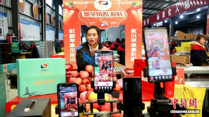 销售人员在网络平台推荐产自延安洛川的苹果。 李进 摄