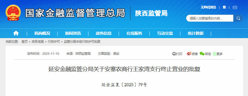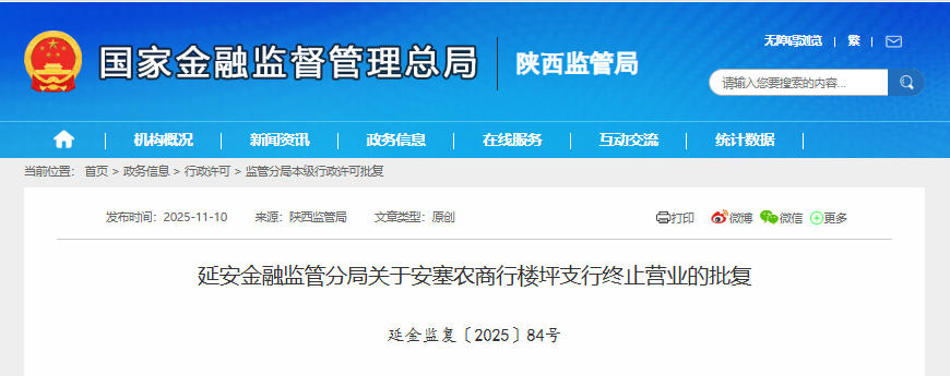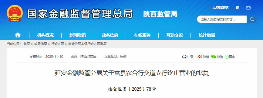 根据公开的批复文件,陕西秦农农村商业银行文体路支行(陕金监复〔2025〕282号)获准终止营业。此外,延安地区有三家支行获批终止营业,包括富县农村合作银行交道支行(延金监复〔2025〕78号)、陕西安塞农村商业银行王家湾支行(延金监复〔2025〕79号)和楼坪支行(延金监复〔2025〕84号)。