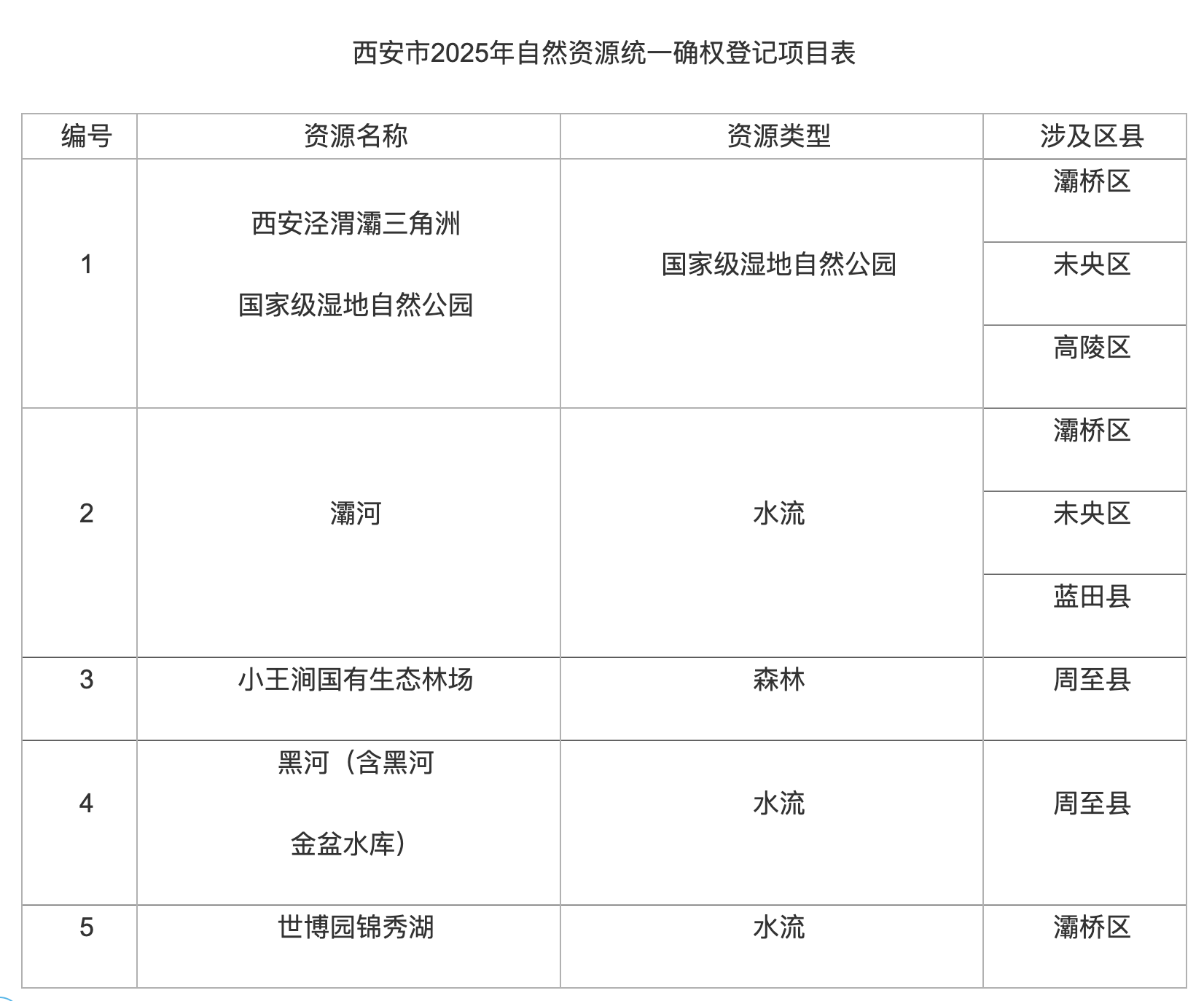据悉,本次登记区域涉及未央区、灞桥区、高陵区、蓝田县、周至县等5个区县,登记单元内的水流、森林、山岭、草原、荒地、滩涂以及探明储量的矿产资源等自然资源的国家所有权和自然生态空间。
