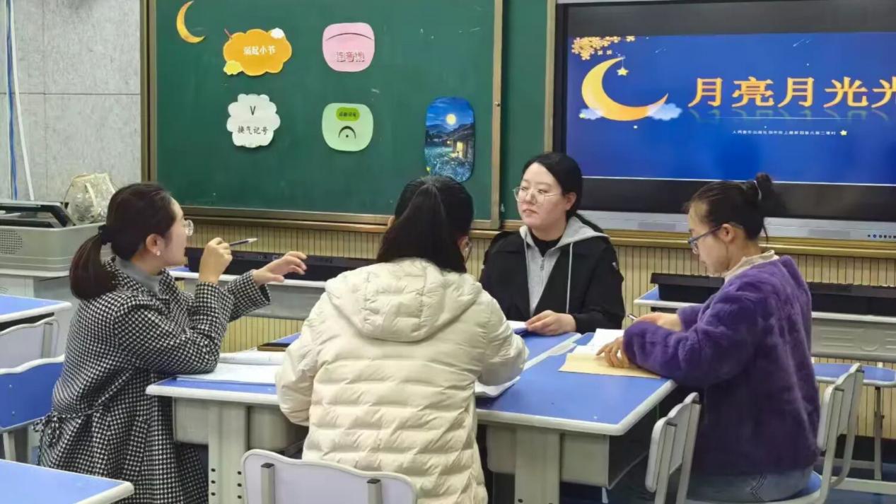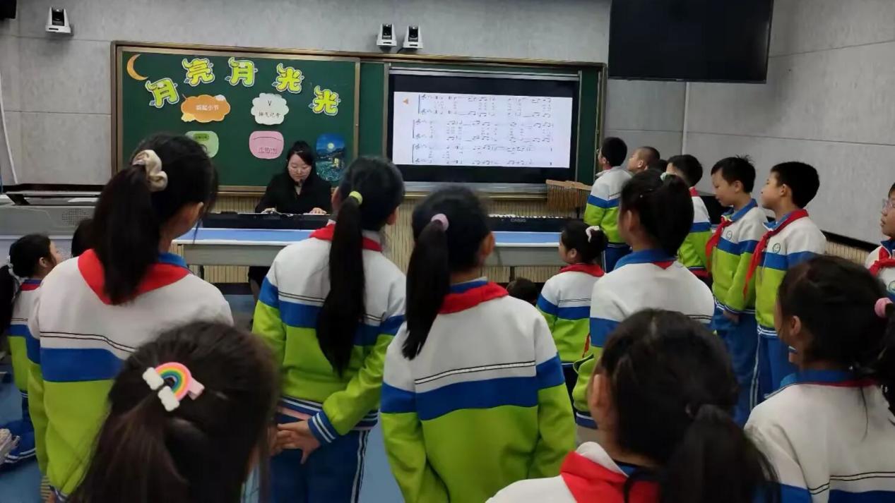 音乐课堂则以经典童谣《月亮月光光》为桥梁,构建起“聆听—学唱—创编”的完整教学链。段东玮老师通过“月光朦胧”的情境创设点燃学生想象,采用“情境代入法”引导学生用轻柔嗓音传递夜的宁静,既化解演唱难点又深化抒情意境。当清澈的童声完整响起时,教室仿佛浸润在温柔的月光里。在“音乐创想”环节,孩子们即兴编唱“月亮月光光,照我小床旁”等新词,让音乐成为情感表达与创造力飞扬的翅膀,歌声里满溢童真与美好。