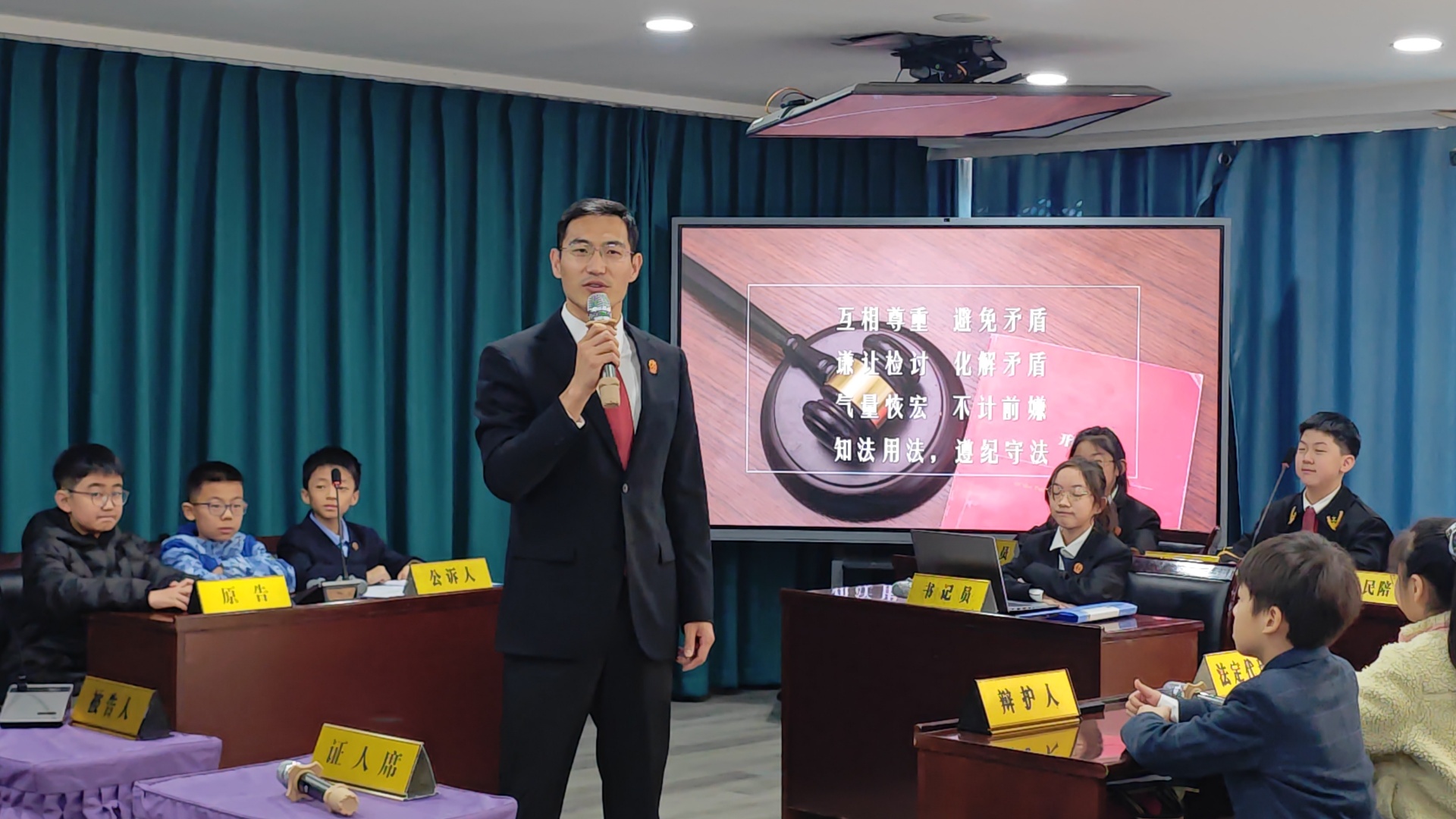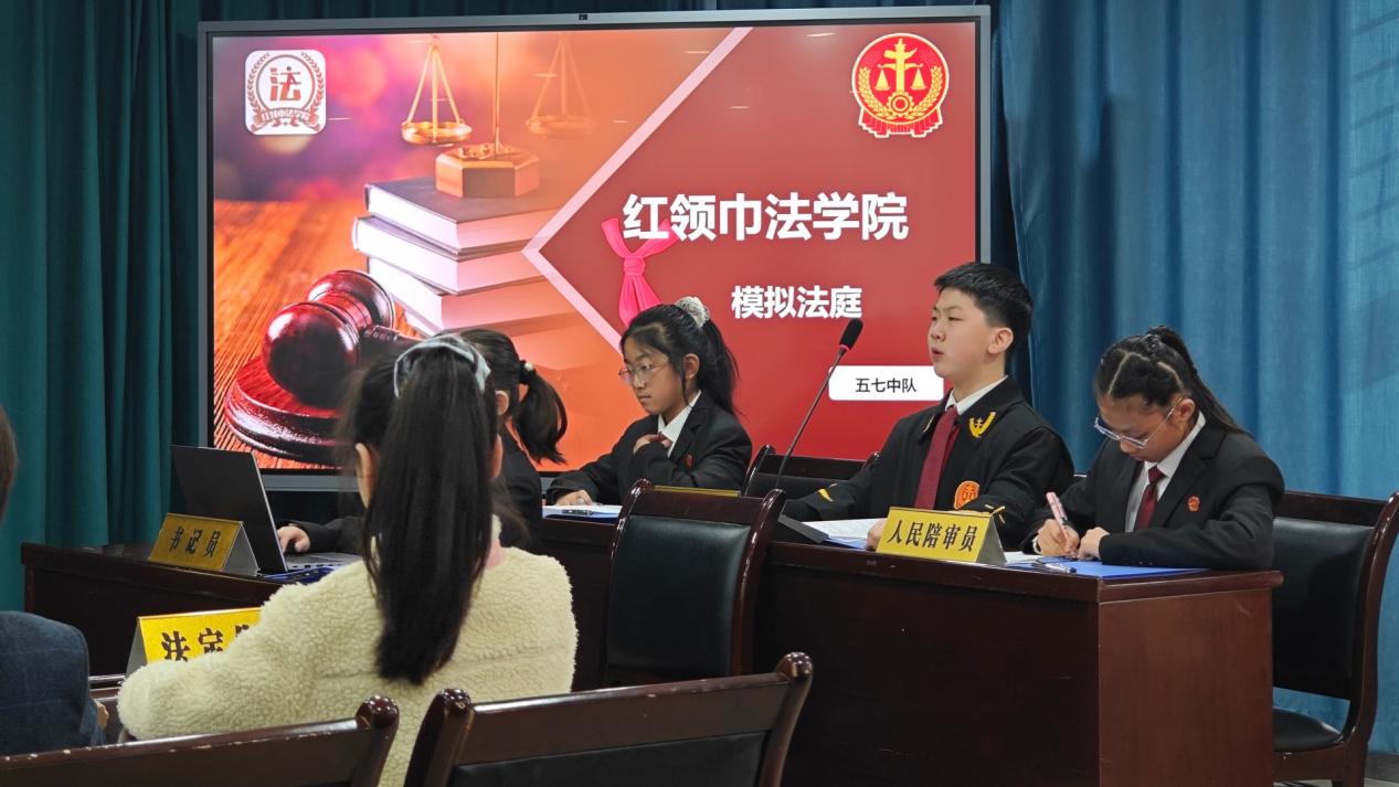 法治教育主题环节通过“红领巾法学院”庭审全过程呈现。李颜妮老师和五年级七班学生以“模拟法庭——未成年人盗窃案”为载体,完整还原法庭调查、辩论、宣判等流程。雁塔法院法官逯如碧亲临现场进行专业点评,对同学们精准演绎各庭审环节、具象化呈现法律权威与尊严的表现给予高度赞赏,并叮嘱同学们将规则意识内化于心、外化于行,坚守法律底线、守护自身权益。