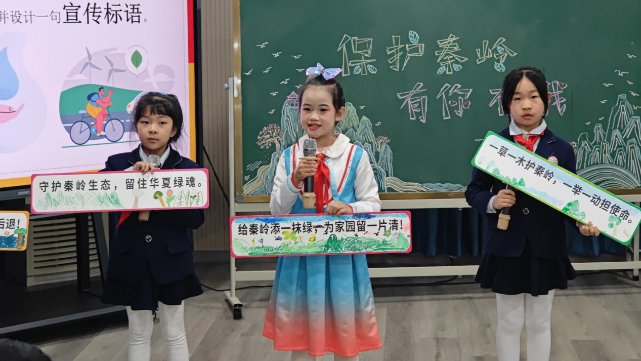 在生态保护主题环节,杨珊老师和三年级二班同学通过班会课《保护秦岭 有你有我》,以“情景演绎+实地探访分享”为亮点,通过朗诵、三句半、环保创意展示等鲜活形式,生动诠释“绿水青山就是金山银山”的理念,引导同学们争做秦岭生态的守护者、绿色家园的建设者。