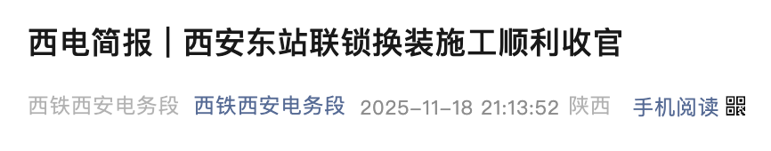 11月18日,一列下行X8611次列车缓缓驶过西安东站普速场,标志着西康线新建西安东站联锁换装施工顺利收官,西安东站普速场正线设备正式投入使用!