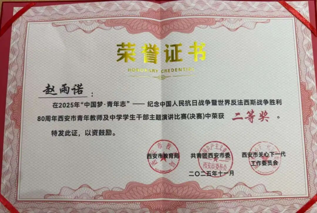 近日,从西安市灞桥区东城第二小学传来喜讯,该校教师赵雨诺在“中国梦·青年志”——纪念中国人民抗日战争暨世界反法西斯战争胜利80周年西安市青年教师及中学学生干部演讲比赛中斩获二等奖。