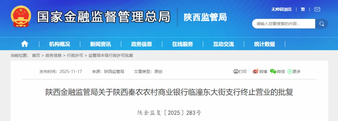 11月20日,陕西金融监管局发布关于华夏银行股份有限公司西安和平路支行终止营业的批复;11月17日,该局发布关于兴业银行股份有限公司西安西市佳园社区支行终止营业的批复;同日,发布关于上海浦东发展银行股份有限公司西安西稍门支行终止营业的批复及关于中国民生银行股份有限公司西安国亨小微支行终止营业的批复;11月10日,该局发布关于陕西秦农农村商业银行临潼东大街支行终止营业的批复。