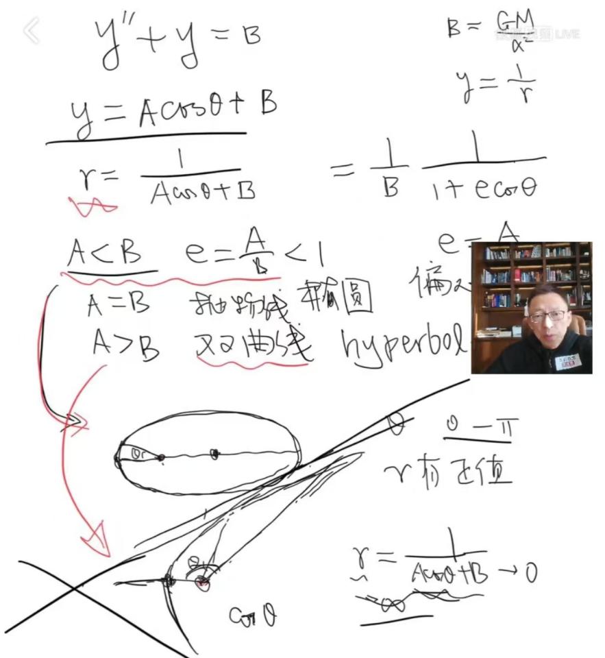 本次课程聚焦分析3I/ATLAS彗星的轨道。张朝阳表示,这颗彗星并非太阳系的常驻成员,而是一位来自星际空间的“过客”。他在直播课上求解了牛顿引力势中星球轨迹的方程,结果表明轨迹可被分成三类,分别是椭圆、抛物线与双曲线。而3I/ATLAS的轨迹正属于双曲线这一类,它在太阳引力的作用下拐一个大弯,最终会远离太阳系并不再返回。