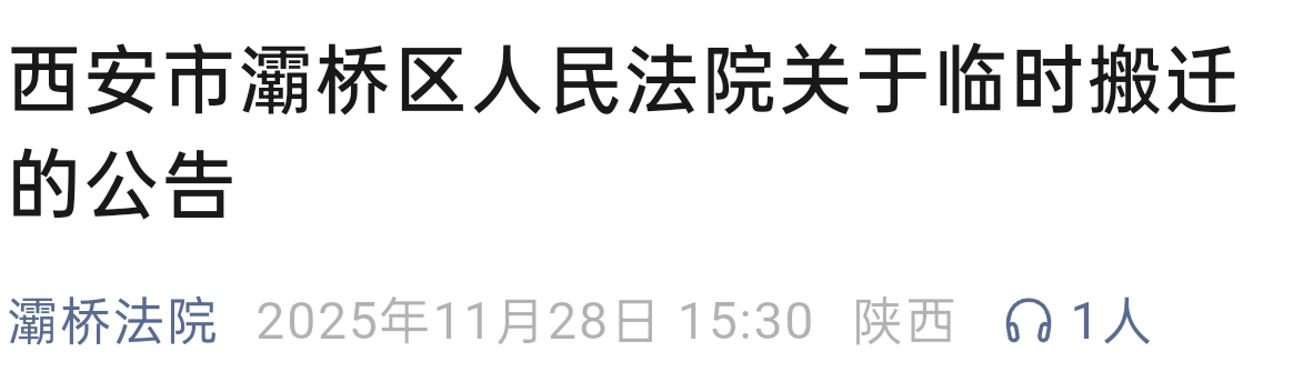 西安市灞桥区人民法院于11月28日发布公告,为进行审判办公大楼的修缮加固,法院启动临时搬迁工作。自12月1日(周一)起,法院的主要审判办公职能将临时迁至西安市灞桥区柳雪路9号(西安灞河新区开发建设管理委员会)办公。据悉,本次搬迁为临时性质,待原址(纺一路668号)修缮完成后将回迁。