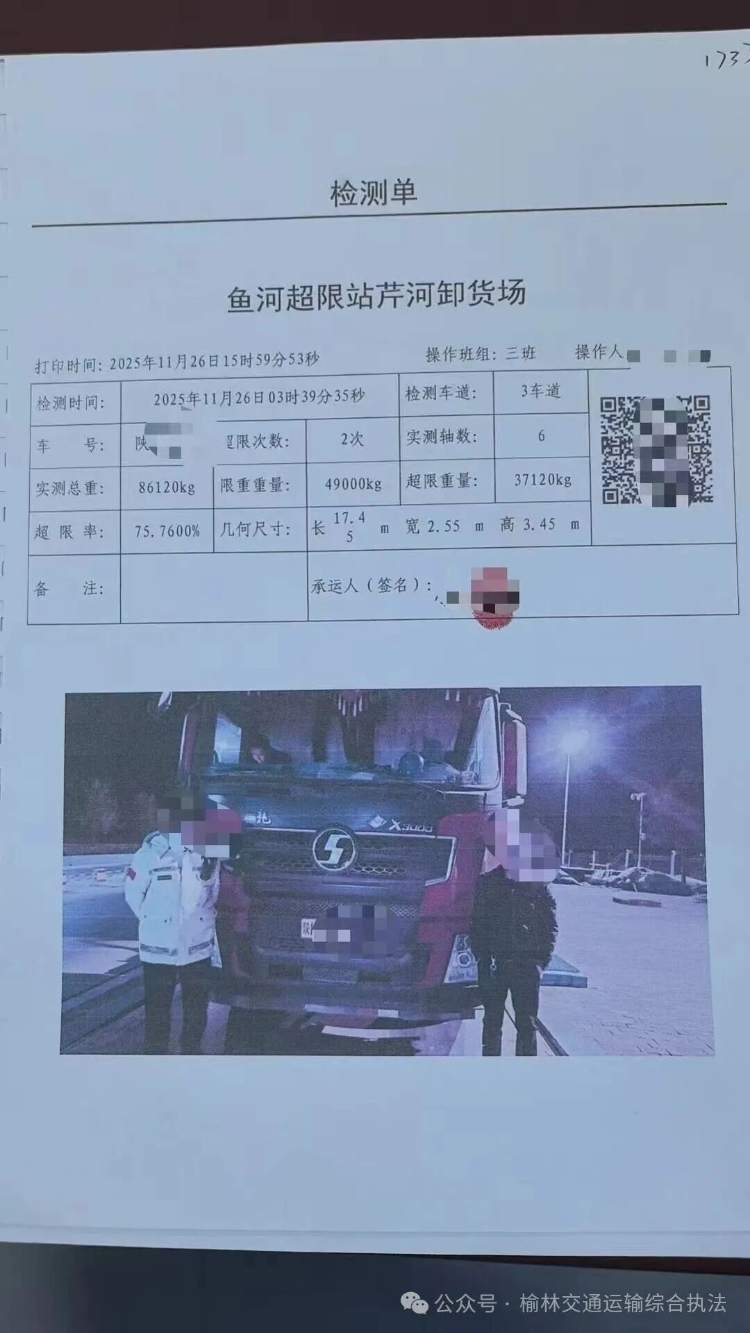 2025年11月26日,联合执法人员与市公路局鱼河超限检测站开展联合执法行动。执法人员在S106路段巡查时发现,钟某驾驶的陕KR01**挂重型6轴挂车涉嫌超限运输。该车运载粉煤灰,随车磅单显示发货单位为榆林市浩**材有限责任公司,收货单位为米脂县水泥厂。经引导至鱼河超限检测站进行精确称重,检测结果显示该车车货总重达86.12吨,而六轴汽车列车限重为49吨,超限37.12吨,超限率高达75.76%。
