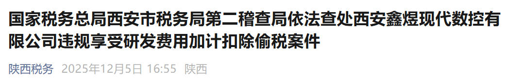 近日,国家税务总局西安市税务局第二稽查局依法查处一起企业违规享受研发费用加计扣除政策偷税案件。
