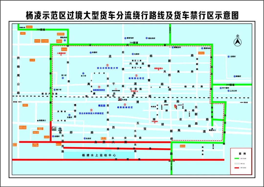 据悉,此次禁行时间覆盖全天24小时,包含周末及法定节假日,未发布解除禁行通告前,禁行措施持续实施。禁行区域“杨凌大道(兴平路丁字)-北环路-344国道-东环北路-渭惠路(西宝中线)-东环南路-自贸大街(新桥路自贸大街十字)”形成的区域以内为货车禁行区。禁行路段包括河堤路全段、滨河路(新桥路滨河路十字以西路段)、自贸大街(新桥路自贸大街十字以西路段)、杨凌大道(杨凌大道兴平路丁字以南路段),以上区域和路段禁止货车通行,其他区域道路可以通行。