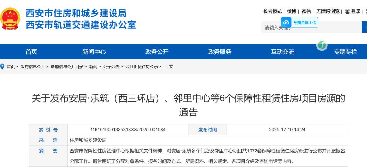 12月10日,西安市保障性住房管理中心发布通告,集中推出六个保障性租赁住房项目共计1072套房源,涵盖阎良、雁塔、莲湖、高新区及航空基地等多个区域。这批房源将于12月11日至15日开放线上申请,采取“网上报名、网上审核”方式,为符合条件的市民提供新一轮住房保障。