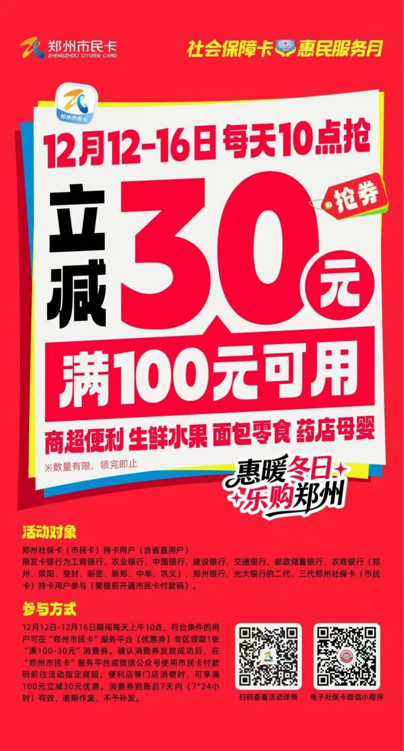 连发5天,又一波消费券来了——12月12日起至12月16日每天上午10点,郑州社保卡(市民卡)将发放新一批消费券,郑州社保卡(含省直)用户可通过郑州市民卡APP参与领取。