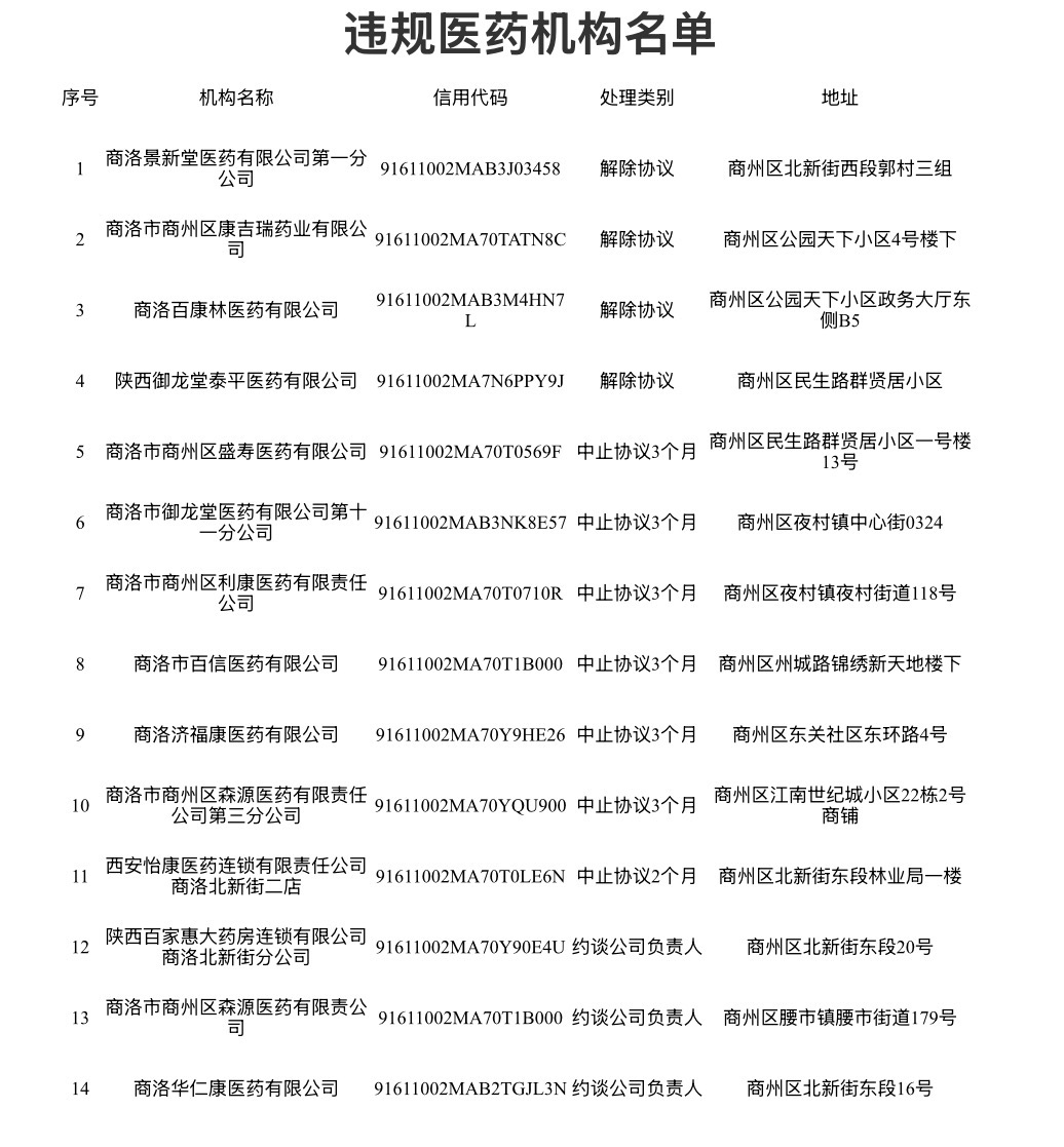 近日,商洛市商州区医保经办中心发布关于解除医保协议(暂停医保结算)的通告(2025年第二批),公布了14家医药机构医保违规名单。