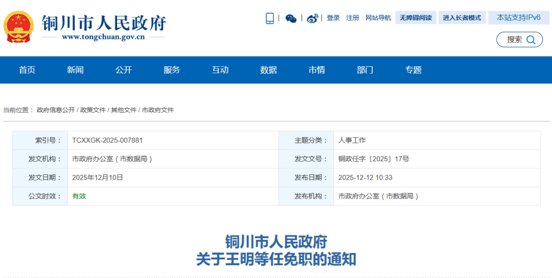 12月12日,铜川市人民政府发布关于王明等任免职的通知。
