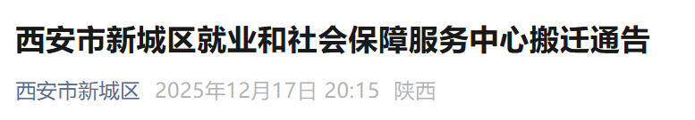 为优化政务服务环境,提升行政效能,12月16日,西安市新城区就业和社会保障服务中心发布通告称,部分业务窗口将于近日搬迁至新址。
