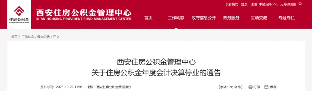 12月22日,西安住房公积金管理中心发布《关于住房公积金年度会计决算停业的通告》。