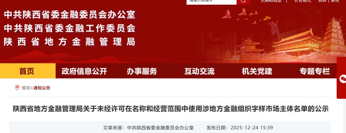 12月24日,陕西省地方金融管理局发布公告,公开曝光省内255家未经许可,却在名称或经营范围中违规使用涉地方金融组织字样市场主体名单。