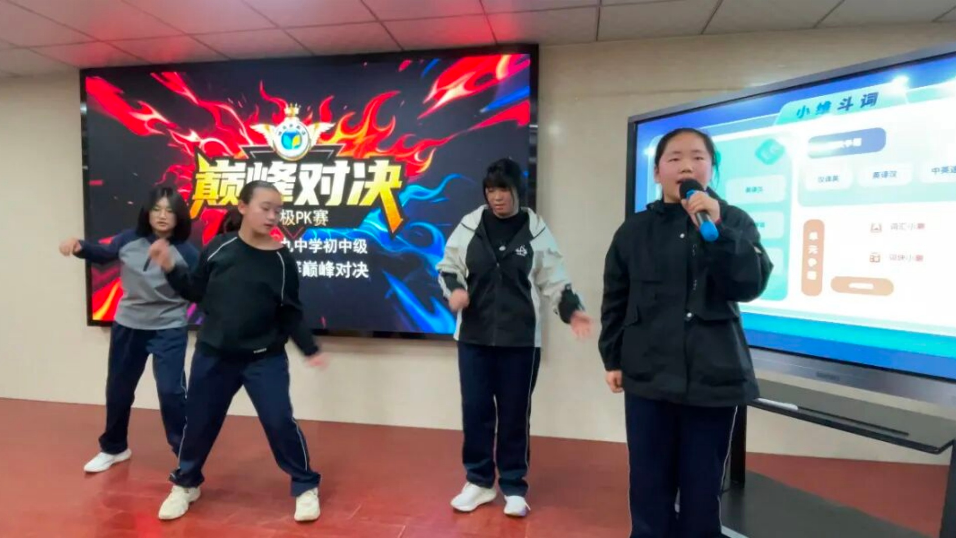 比赛依托“小维斗词”平台进行现场淘汰赛,分为七年级组和八九年级组两个赛道。赛制融合词汇积累、反应速度与团队协作,既考验学生的语言基础,也锻炼临场应变能力。舞台上屏幕闪烁、战鼓催征,选手们全神贯注、沉着作答,每一次正确拼读都引发台下阵阵欢呼,现场高潮迭起。