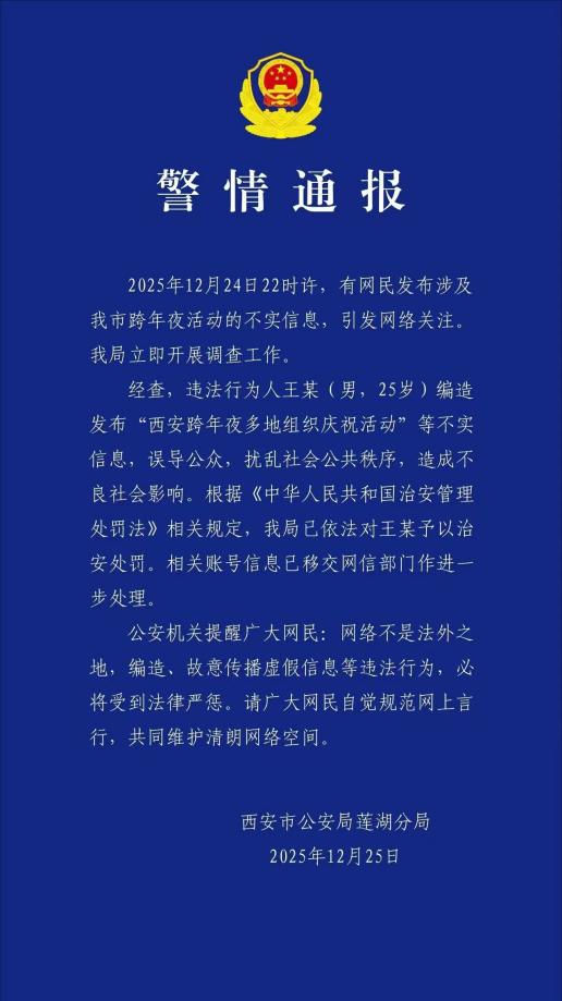 通报称,12月24日22时许,有网民发布涉及西安市跨年夜活动的不实信息,引发网络关注。经查,违法行为人王某(男,25岁)编造发布"西安跨年夜多地组织庆祝活动"等虚假信息,误导公众,造成不良社会影响。