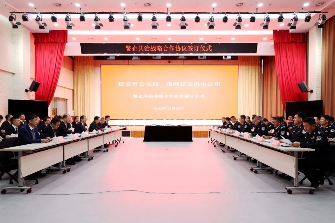 2025年12月24日,延安市公安局与国网延安供电公司成功举行警企共治战略合作协议签订仪式。副市长、市公安局党委书记、局长耿军强出席签约仪式并讲话;市公安局党委委员、常务副局长孟小钧与国网延安供电公司总经理贺鸿祺代表双方签署《警企共治战略合作协议》;市公安局党委委员、副局长张富前宣读合作协议;国网延安供电公司副总经理李舟宣读《关于深化警企共治服务高质量发展的实施意见》。