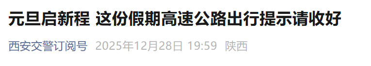 12月28日,西安交警发布元旦假期高速公路出行提示,重点分析了易堵路段和时段,提醒市民提前规划路线,错峰出行。