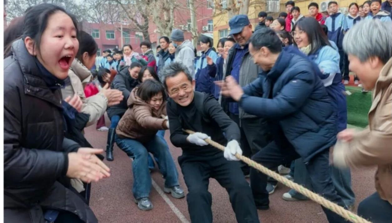 与此同时,教职工拔河比赛也在热烈氛围中展开。工会以“拧成一股绳,奋进新一年”为主题,组织各年级、处室代表队参赛。赛前,工会组织委员杨光带领全员热身拉伸;赛中,“一二!加油!”的口号震彻校园,教职工紧握绳索、身体后倾,双脚如钉般扎地,每一次拉锯都凝聚着协作之力。学生组成的“最强啦啦队”挥舞双手呐喊助威,“老师加油”的呼喊与师生的欢笑声汇成暖流。最终,高三年级摘得桂冠,七年级、九年级分获亚季军。“这根拔河绳,拉满了十九中人的精气神。新的一年,我们将继续团结奋进,再创辉煌!”雷婧校长感慨道。