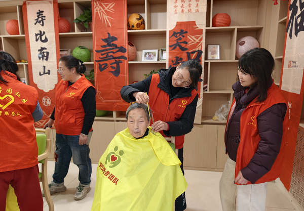 在理发区,几位擅长理发的志愿者细心摆放好工具,耐心询问每位老人的发型需求。“您想剪短一些,还是稍微修整一下?”“阿姨,这个长度合适吗?”伴随着剪刀清脆的声响,老人们原本略显凌乱的头发变得整洁利落。看着镜中焕然一新的自己,老人们脸上绽放出笑容,连连向志愿者表示感谢。