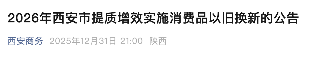 近日,西安市商务局发布2026年西安市提质增效实施消费品以旧换新的公告,具体内容如下: