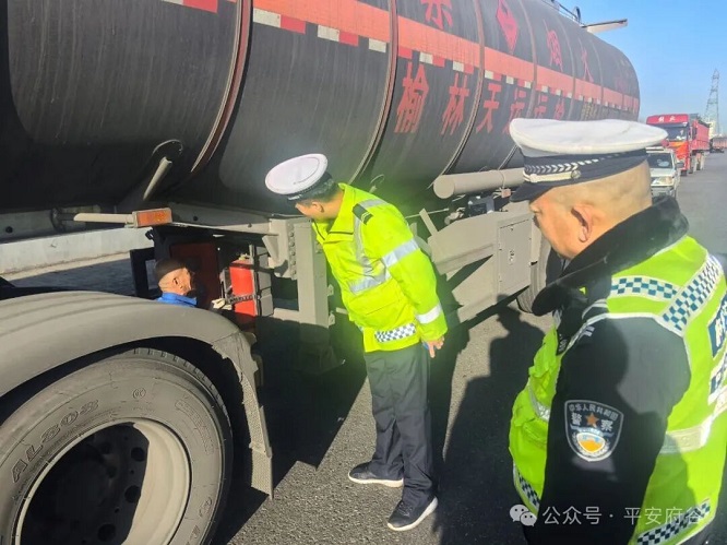 为强化危险化学品运输车辆安全管理,有效防范化解道路交通安全风险,近日,榆林市府谷县公安局交管大队大昌汗中队聚焦辖区重点路段、重点区域,集中开展危化品运输车辆专项检查行动,从严从实排查隐患,全力筑牢交通安全防线。