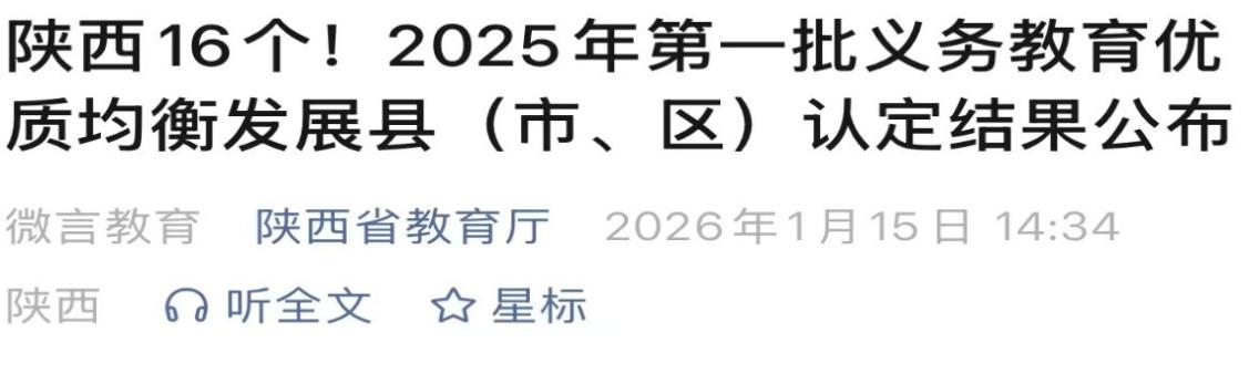 1月15日,教育部公布2025年第一批义务教育优质均衡发展县(市、区)认定结果,全国共326个地区入选,其中陕西省有16个县(市、区)上榜。