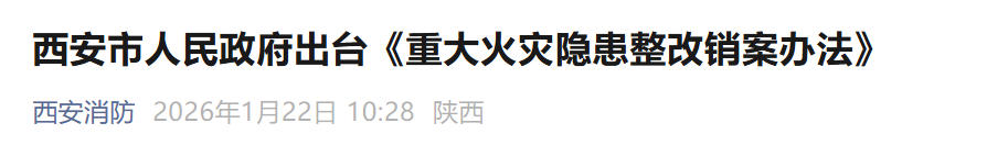 近日,西安市人民政府办公厅正式印发《西安市重大火灾隐患整改销案办法》(市政办函〔2026〕3号),系统构建重大火灾隐患"发现、交办、处置、核验、销号"全链条闭环管理机制,为全市火灾隐患整治工作提供制度保障。