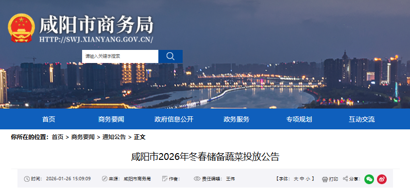 近日,记者从咸阳市商务局获悉,为保障春节“菜篮子”供应稳价,咸阳市将于2026年2月2日至7日,在主城区投放冬春储备蔬菜。
